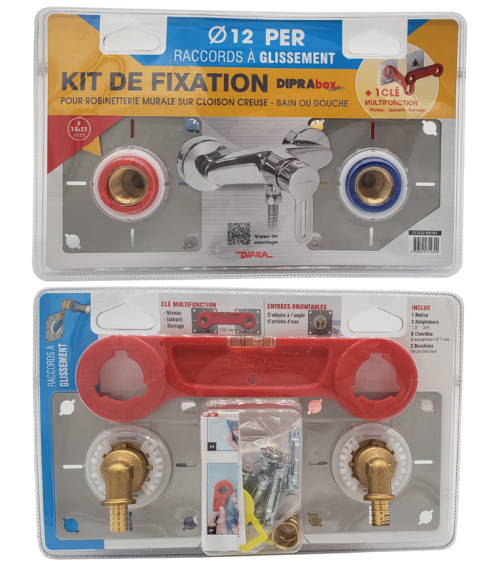 Kit de fixation DIPRA BOX glissement pour robinet, douche et baignoire alimentée en PER Ø12 avec alimentation dans une cloison ou un mur.